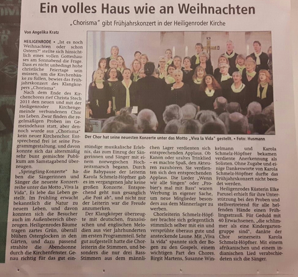 Im Frühling erwacht die Natur zu neuem Leben und so haben die Sängerinnen und Sänger von "Chorisma - Gospel and more Heiligenrode" ihre diesjährigen SpringSing-Konzerte unter das Motto “Viva la vida” gestellt - Es lebe das Leben! Das frühlingshafte Programm verspricht eine bunte Mischung aus deutschen und internationalen Liedern und reicht vom mittelalterlichen französischen Trinklied über einen norwegischen Brautmarsch bis zu einer stimmungsvollen a-cappella-Version von Coldplays “Viva la vida”. Natürlich werden auch wieder schwungvolle Gospel und beliebte Lieder aus dem Repertoire zu Gehör gebracht.